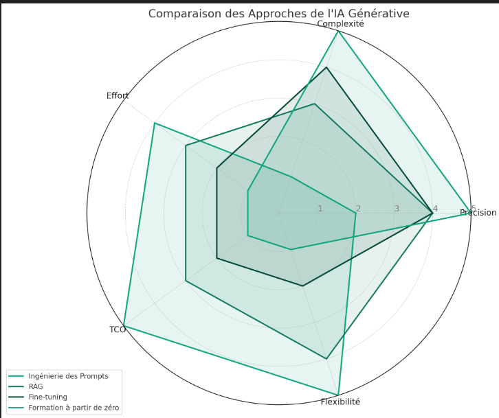 - Coût total de possession (TCO) : Plus élevé que pour RAG et l'ingénierie des prompts en raison de la puissance de calcul requise et de la compétence technique nécessaire.