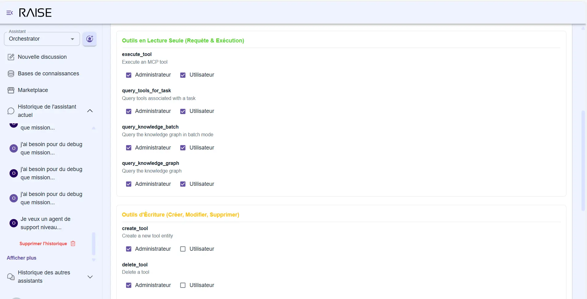 Gestion des permissions sur les outils : distinction entre outils en lecture seule et outils d'écriture, avec droits Administrateur vs Utilisateur