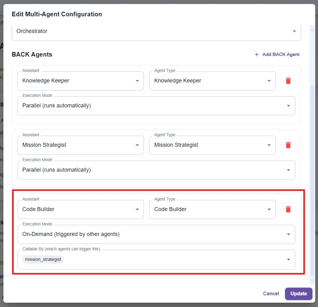 Configuration multi-agents : ajout d'un agent Code Builder en mode On-Demand, appelable par le Mission Strategist