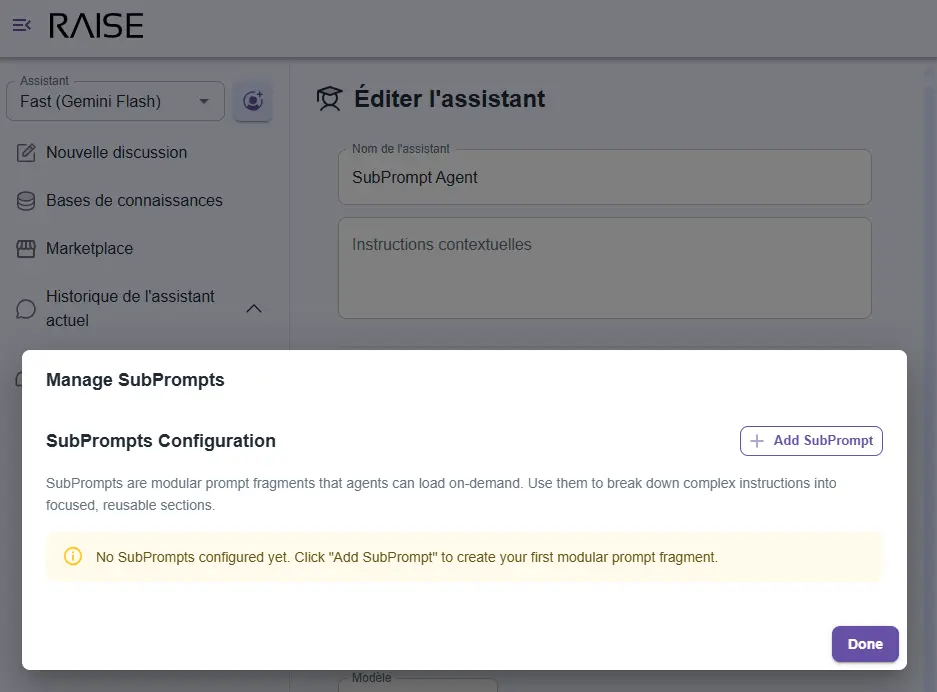 Dans RAISE, nous avons implémenté un système de subprompts : des fragments d'instructions modulaires que l'agent charge dynamiquement selon le contexte.