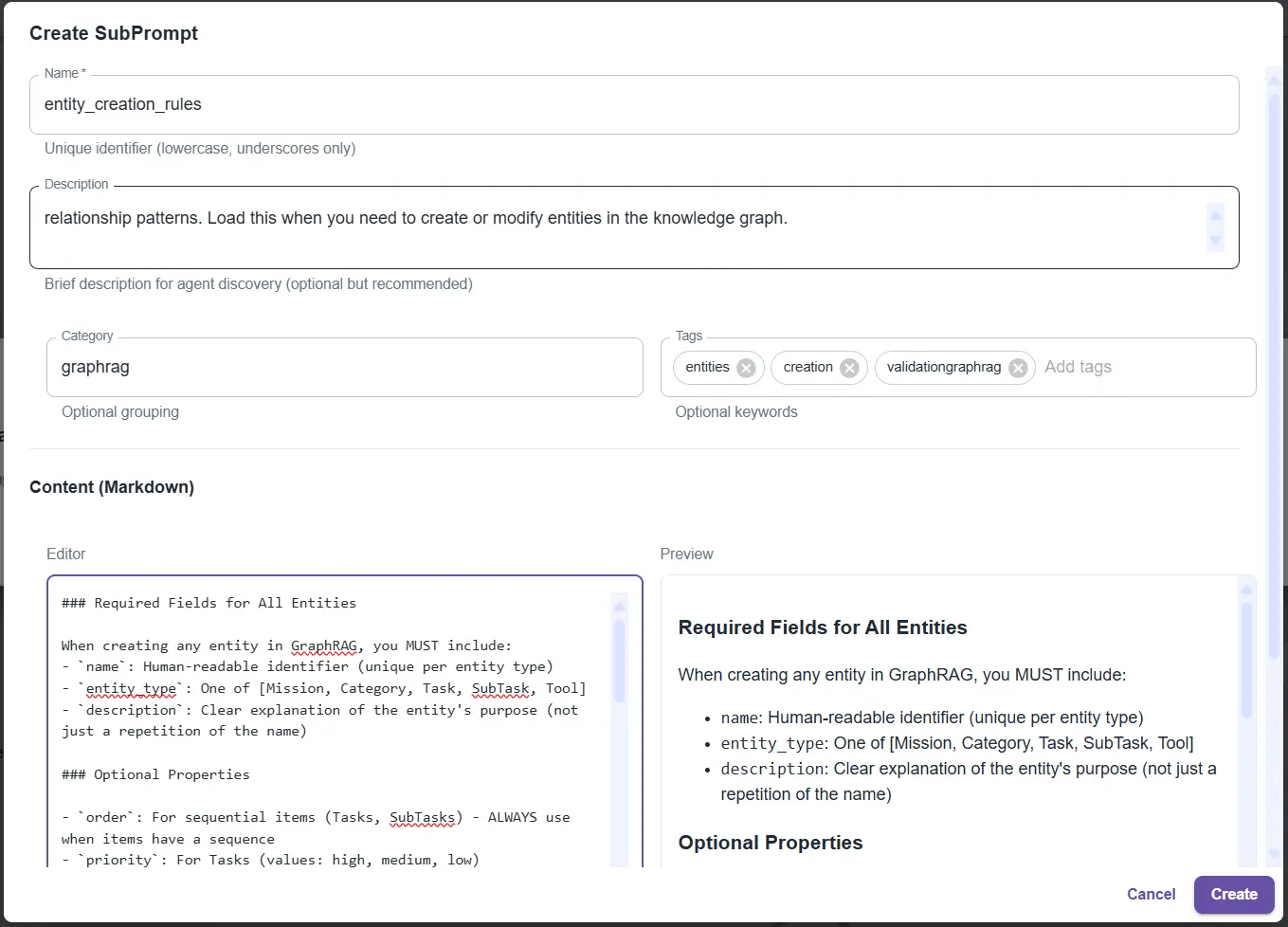 Création d'un SubPrompt "entity_creation_rules" : règles détaillées pour créer des entités dans le graphe de connaissances