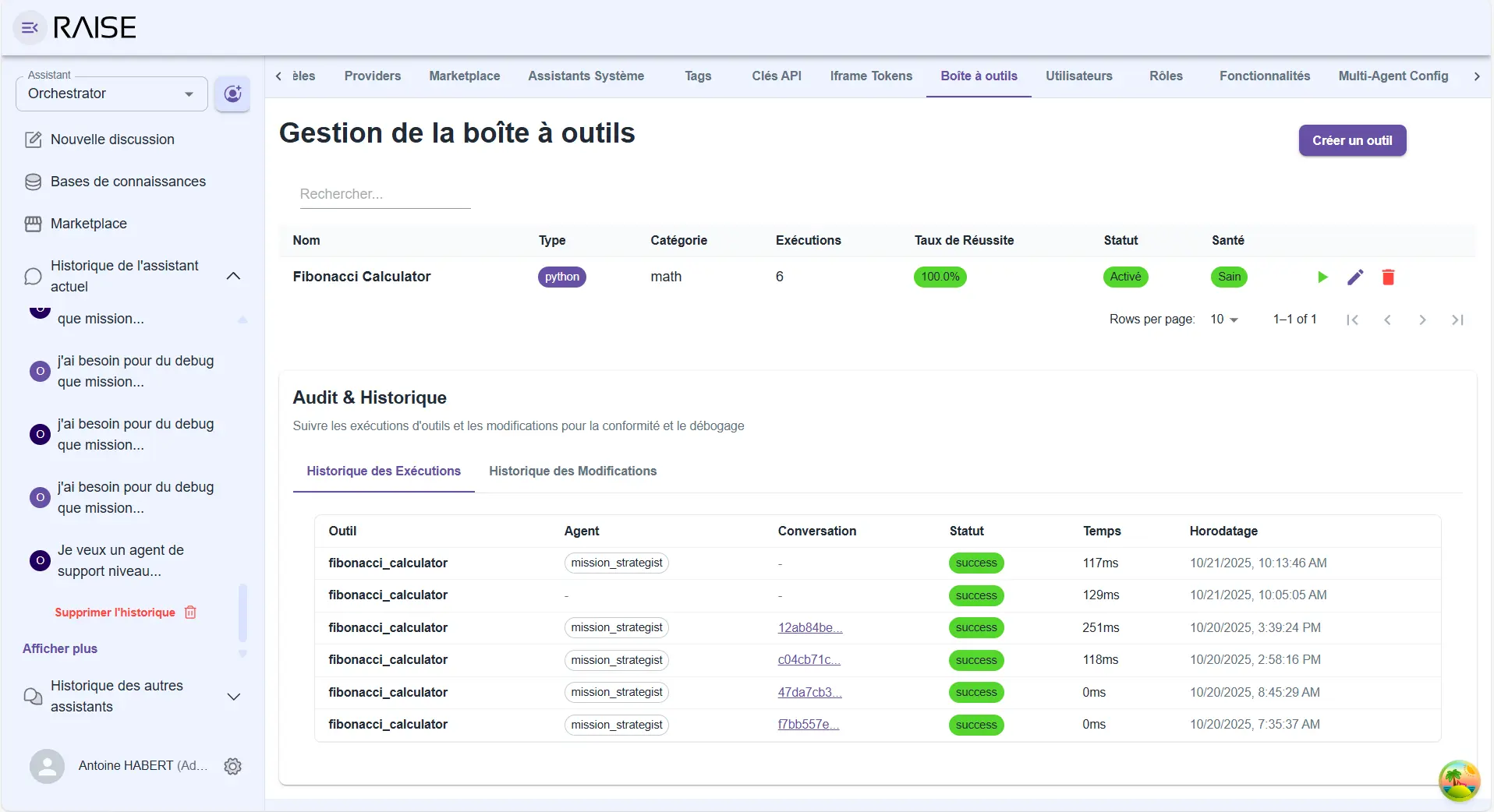 Boîte à outils : catalogue d'outils disponibles avec historique d'exécutions et audit complet (Fibonacci Calculator exemple)