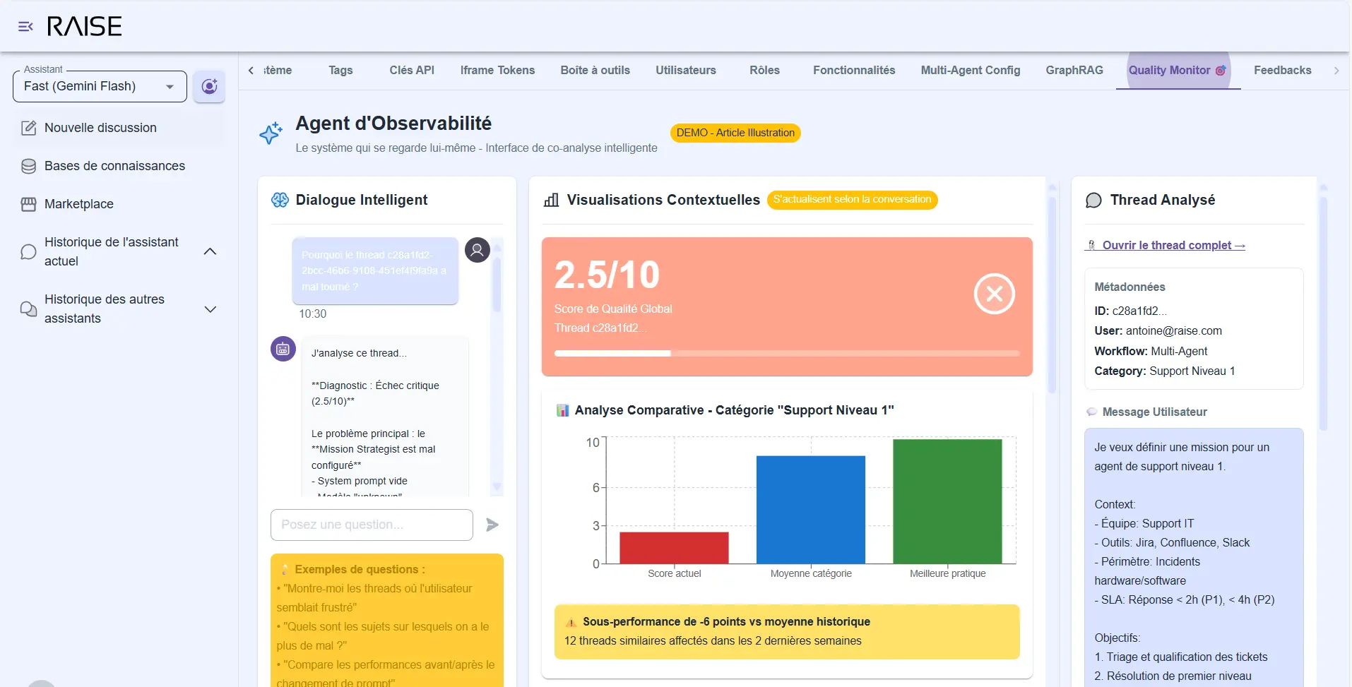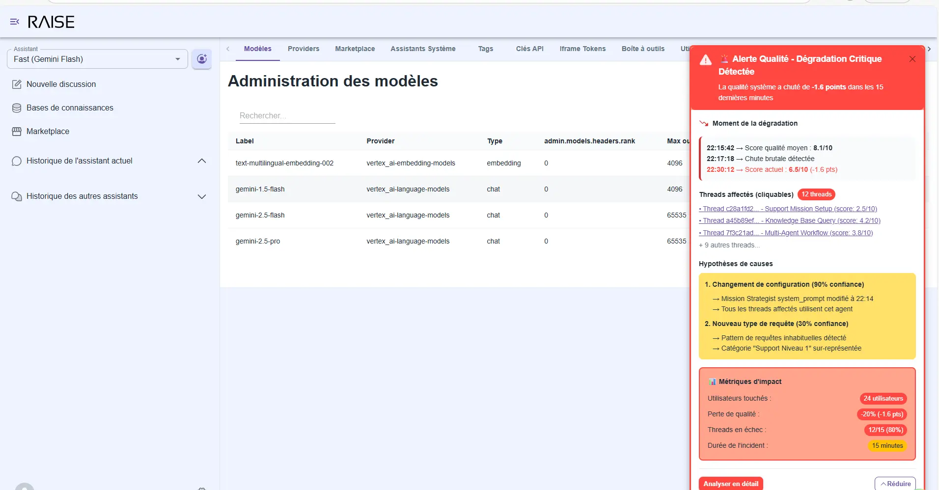 Les anomalies en temps réel : si la qualité décroche soudainement, l'agent d'observabilité vous alerte immédiatement :