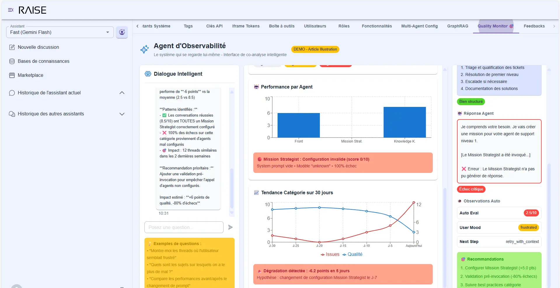 Diagnostic avancé : performance par agent, erreur Mission Strategist détectée, tendance catégorie sur 30 jours