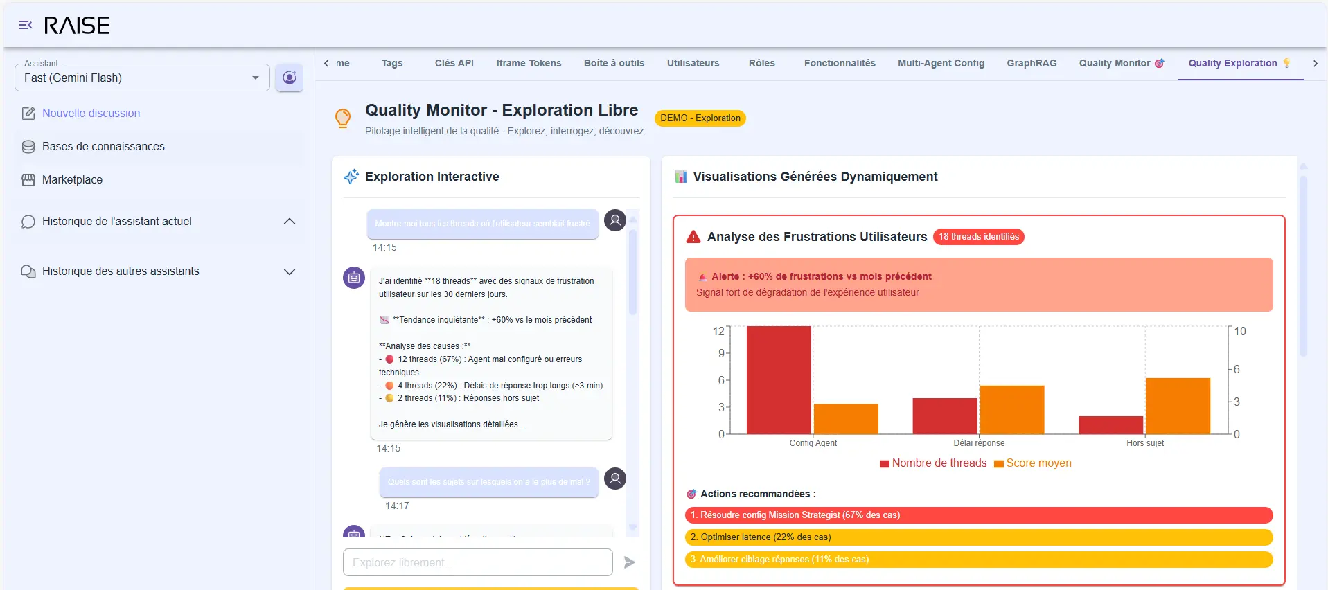 Quality Monitor - Exploration Libre : analyse de frustrations utilisateurs (+80% vs mois précédent) avec causes identifiées et recommandations