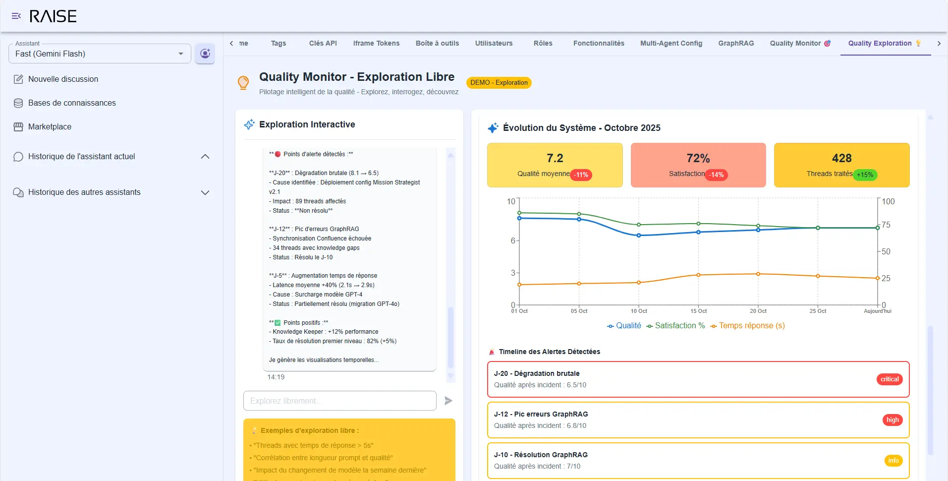 Évolution du système - Octobre 2025 : qualité moyenne 7.2/10, satisfaction 72%, 428 threads traités avec timeline des alertes détectées